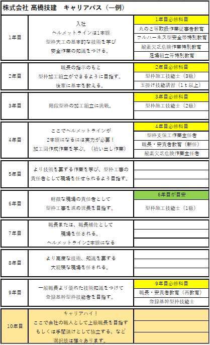 これは、あくまで一例ですが弊社では図のように入社年数に応じて一定の到達目標を立て、その年数によって取得すべき資格を明確にしています。