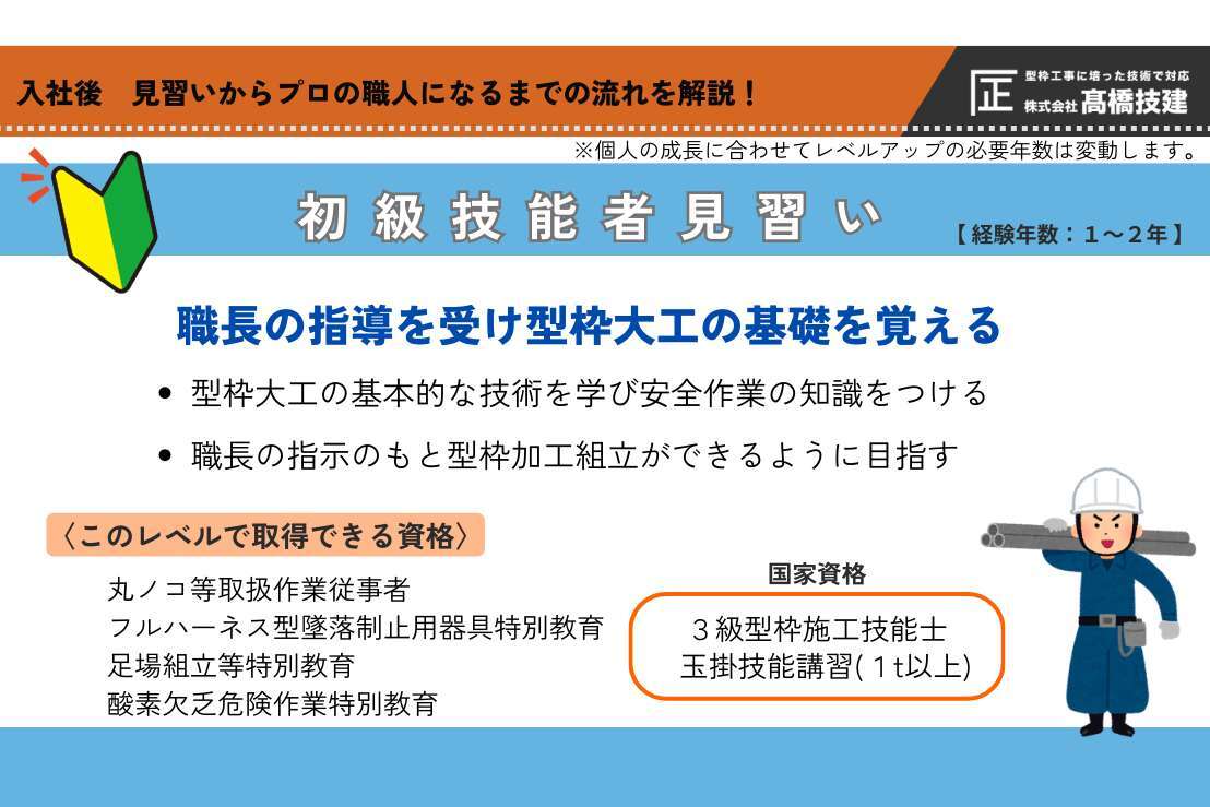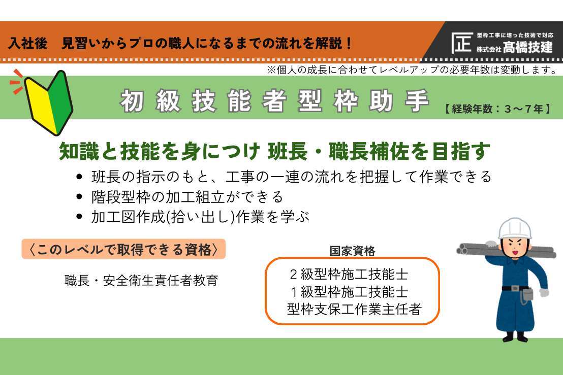経験年数3~7年の方は「初級技能者型枠助手」となります。