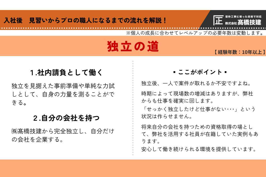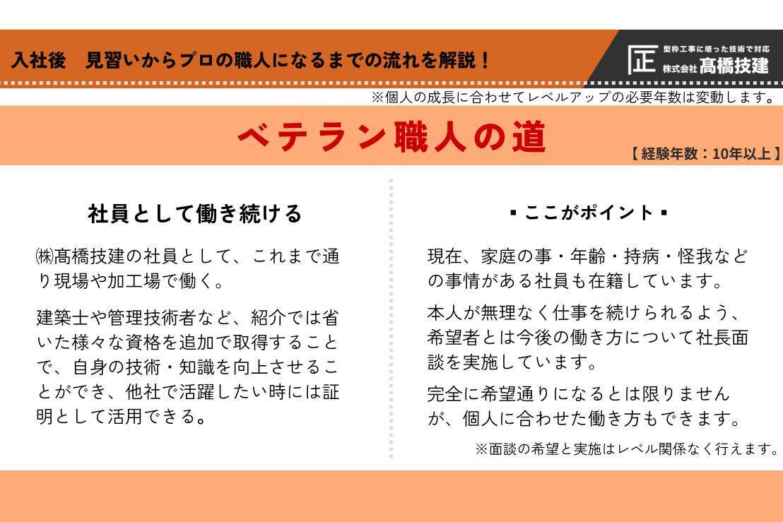 弊社基準では、「経験年数10年以上」+「登録型枠基幹技能士」を取得することがレベルアップの条件です。